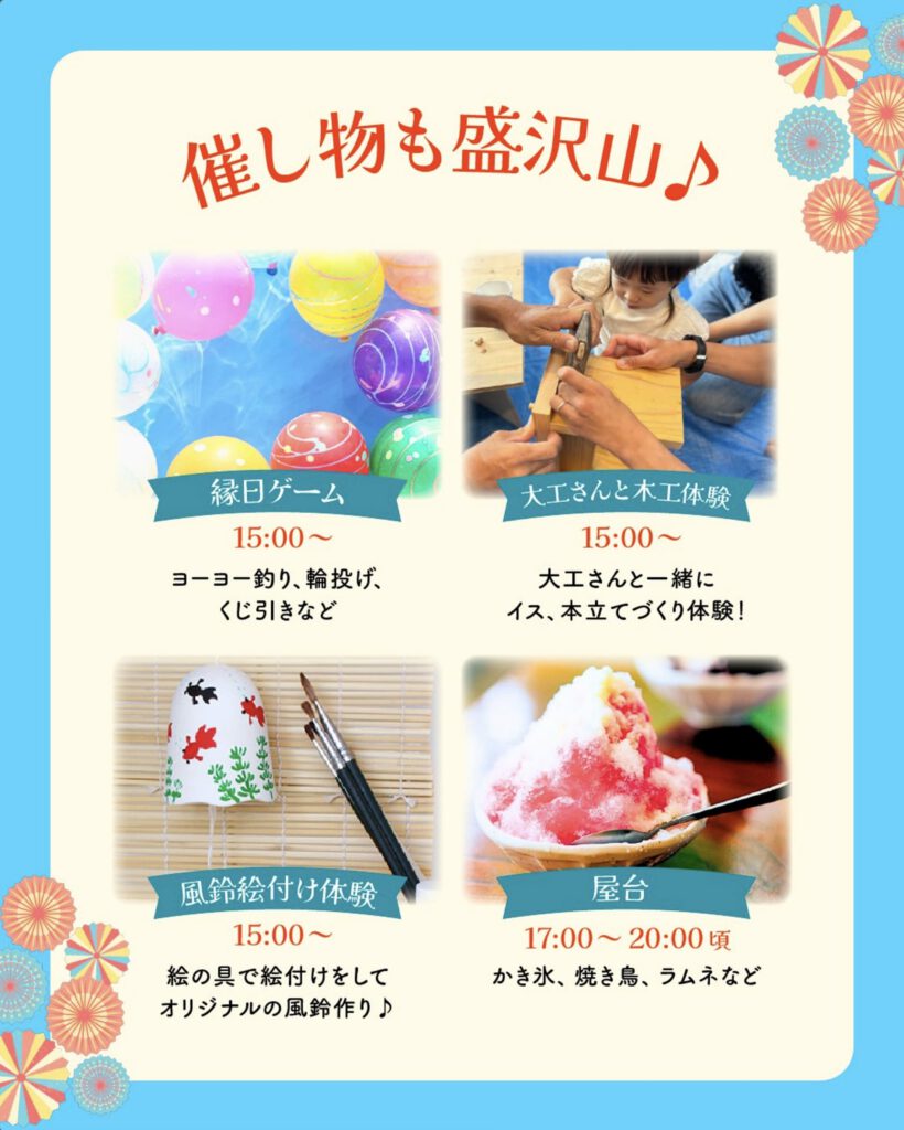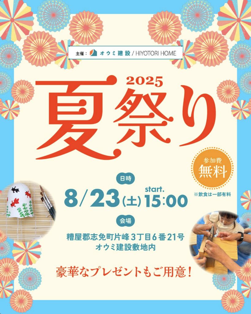 8月23日(土)にオウミ建設にて、〈第1回 夏祭り2025〉を開催します。 当日は、大工さんとつくる木工体験や風鈴絵付け体験、縁日ゲーム、屋台など、お子様が楽しめるコーナーがたくさんあります! また、豪華プレゼントもご用意。夏休みの思い出にいかがですか? ご家族そろって、ぜひ遊びにいらしてください
